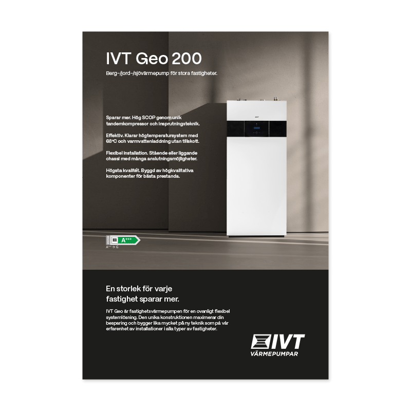 Vi har tillverkat IVT Geo i åtta olika effektstorlekar. Det gör att vi kan sätta ihop en systemlösning som passar de exakta behoven för varje fastighet. Och eftersom du betalar för precis det du behöver blir investeringskostnaden lägre, och besparingen högre.