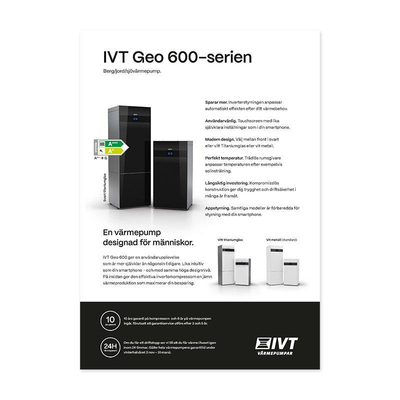 Utvecklad och tillverkad i Småland för att prestera på topp i det nordiska klimatet. IVT Geo 600 är vassare än sina föregångare på allt. Med en tydlig touchscreen i färg och med appstyrning som standard får du en användarupplevelse som är mer självklar än någonsin tidigare. Värmepumpen är lika intuitiv som din smartphone – och med samma höga designnivå. På insidan ger inverterkompressorn en jämn och effektiv värmeproduktion.